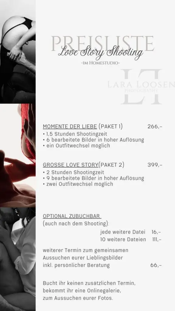 Wir shooten in meinem gemütlichen Koblenzer Home Studio. Ich leite euch sanft an, ohne euch zu überfordern. Ihr müsst euch nicht verstellen; ihr dürft einfach so sein, wie ihr seid.