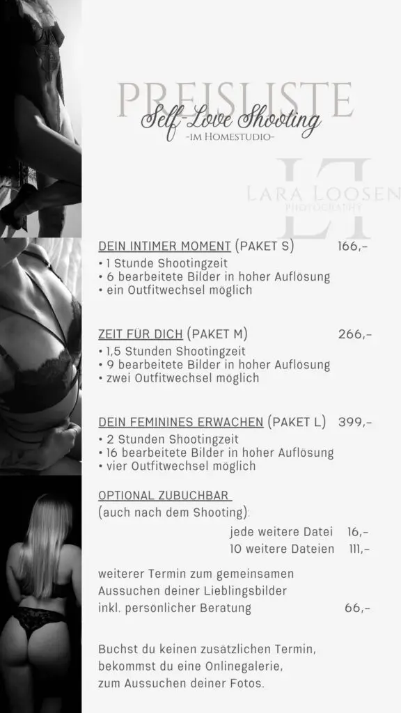 Absolut. Schreib mir einfach, erzähl mir ein bisschen über dich und was du dir wünschst – und ich helfe dir, das perfekte Shooting für dich zu finden. Alles in deinem Tempo, ohne Druck.